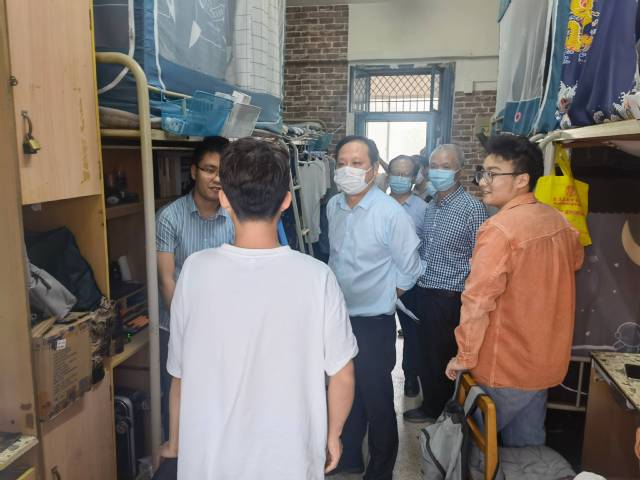 付校长一行认真察看了宿舍的卫生、安全及学生生活情况,并围绕学生近期关注的热点问题、疫情防控相关问题、专业学习、职业生涯规划、校园生活等方面与学生进行了亲切交流。付校长亲切询问同学们,“开学几天学习状态怎么样?”、 “生活上是否存在困难?”、“学校伙食怎么样,是否能适应?”,鼓励同学们调整心态,积极适应疫情时期的校园学习生活,叮嘱同学们要积极营造温馨和睦、健康文明和勤奋向上的宿舍氛围增强防疫意识,做好自身防护,坚持科学锻炼,树立健康心态,努力学习,提升自己,不负韶华。走访期间,聂书记询问同学们有关新学期学习计划、思想状况等情况,耐心了解寝室基本情况,叮嘱同学们要把握好大学时光,打好基础、加强本领,心怀理想,志存高远,相互帮助,共同进步,为未来做好准备;赵院长与学生亲切交谈,深入了解学生的学习和生活情况,尤其是日常生活中遇到的困难和困惑,并鼓励同学们合理安排时间,掌握不同学科的学习技巧,要多与老师、同学交流沟通,鼓励同学们在学习中提升自我素养,在奋斗中追寻理想目标,努力攀登学术高峰,争做拼搏实干的奋力前行者。