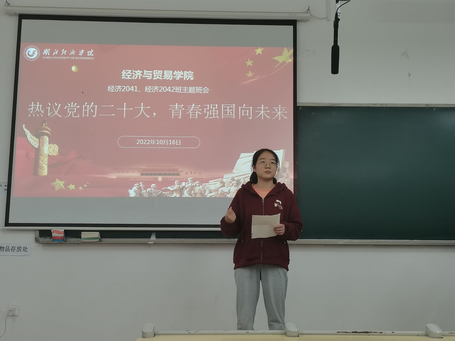 (通讯员:邓晓蓉 黄超 孙悦悦)为学习好、宣传好、贯彻好党的二十大精神,在班主任祝琴老师的倡导下,betway唯一官网必威中文官网电话查询经济2041班与经济2042班同学分别在学校食堂、图书馆、教室、寝室等场所,观看党的二十大开幕会,并于10月16日下午5点在学校教2-111教室召集班上同学开展“热议党的二十大 青春强国向未来”主题班会活动。祝琴要求同学们以经济学专业视角来学习党的二十大精神,用专业知识领悟党的二十大报告。主题班会上,同学们积极踊跃发言,纷纷表示党的二十大精神振奋人心。