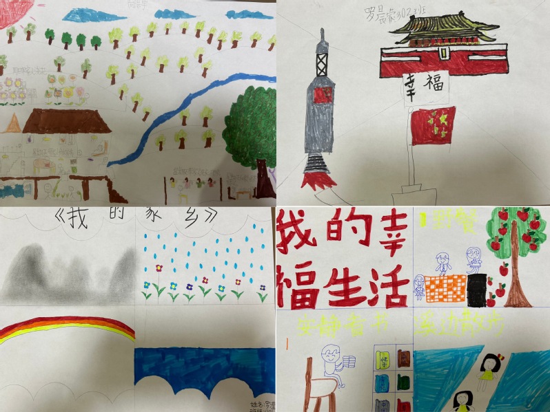 “老师你快看,一望无际的大海旁边是松软的沙滩,当我躺在沙滩上沐浴阳光时我觉得很幸福,我觉得幸福是去游历祖国的大好河山”“老师,我画的是放假的时候我帮家人浇花、做家务、喝茶聊天,和家人做一起做一些事情让我感到很幸福”……李灵和向浩宇兴奋地与幸福课授课队员刘文斌分享自己的幸福。