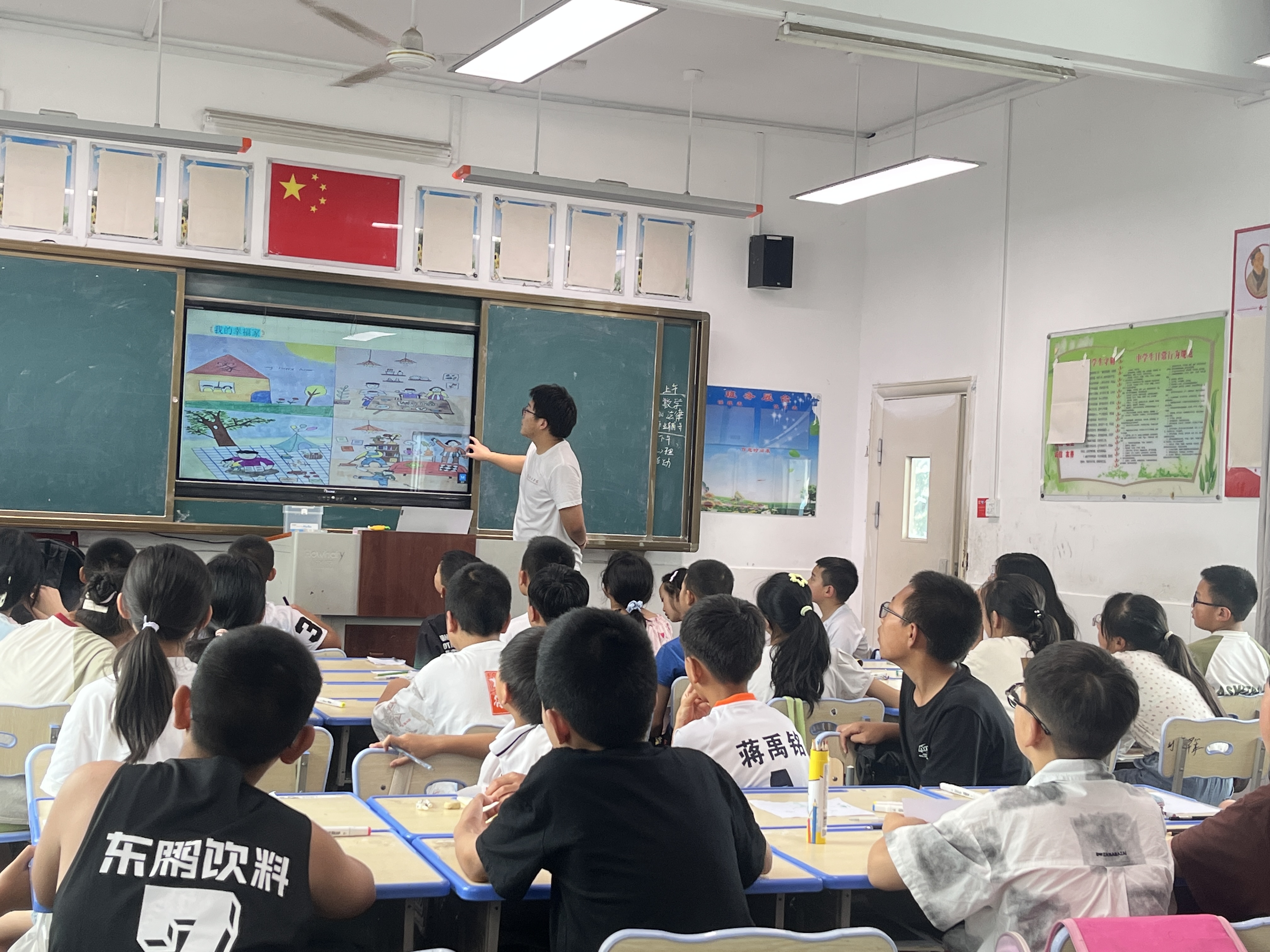 “罗滢小朋友,你为什么画的是家乡呀?”“黄老师,因为我觉得住在自己的家乡很幸福,这里的一切让我觉得很舒服和惬意,我希望等我长大了,能让家乡成为一个更幸福的地方。”这是发生在授课队员黄馨竹课堂上的一段对话,“学生们对幸福的理解有些超出我的意料,但也让我收获很多感动,我希望通过这节课让孩子们在面对未来人生道路上的困难和挫折的时候,能记起自己的幸福,鼓起勇气,勇往直前。”黄馨竹说道。