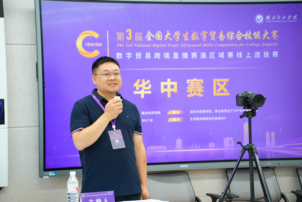 2024年7月20日,第三届全国大学生数字贸易综合技能大赛数字贸易跨境直播赛道华中区域赛在我校举行。该赛事由浙江大学中国数字贸易研究院主办,全国大学生数字贸易综合技能大赛组委会承办,我校为华中区域赛承办单位,必威中文官网电话查询、湖北新质生产力产业发展研究院为协办单位,共有来自华中地区3省21所高校的78支队伍参赛。活动由必威中文官网电话查询副院长乔长涛主持。