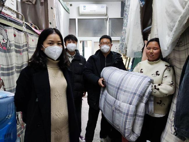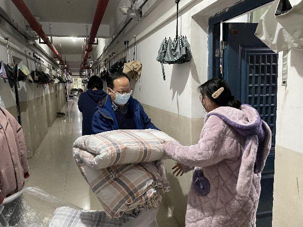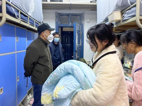 学生们在接过老师手中的棉被后,脸上都露出了开心的笑容。“谢谢学校在疫情期间还惦记着我们,也感谢学院领导老师们在这么冷的天还来给我们送被子”、“本来还担心这个冬天怎么过,但是有了这床棉被这个冬天不再冷了!”,学生们纷纷表达了自己对学校和学院的感谢,有的学生宿舍还拿出水果招待领导老师们。这一刻,即使外面寒风刺骨,但宿舍里洋溢着的温馨和爱足以融化坚冰,师生们的心紧密连在一起。