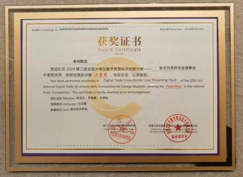 2024年9月29日,第三届全国大学生数字贸易综合技能大赛全国总决赛颁奖典礼在浙江大学紫金港校区金色大厅举行,我院学子在“创新创业”和“跨境直播”两个赛道上均荣获全国三等奖,收获满满。
