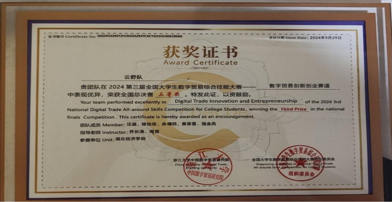 2024年第三届大赛全国大学生数字贸易综合技能由浙江大学中国数字贸易研究院主办,全国大学生数字贸易综合技能大赛组委会承办,旨在激发和培养大学生在数字贸易领域的实践能力和创新精神。本届赛事报名院校527所,报名人数16569人,设立了华北、东北、华东、华中、华南、西南、西北7大赛区。我院师生全情投入,积极备赛,在两个赛道上脱颖而出,由乔长涛、周蓉2两位老师指导的“云舒队”以“线上云游高校”为主题,凭借独特的创意和扎实的方案展现出非凡的创新能力,以创新创业赛道华中区域一等奖晋级全国总决赛;由马玉霞老师指导的“食尚甄选”团队凭借流利的语言表达能力和出色的直播技巧,以跨境直播赛道华中区域一等奖晋级全国总决赛。经过激烈角逐,最终两支团队均荣获全国三等奖。