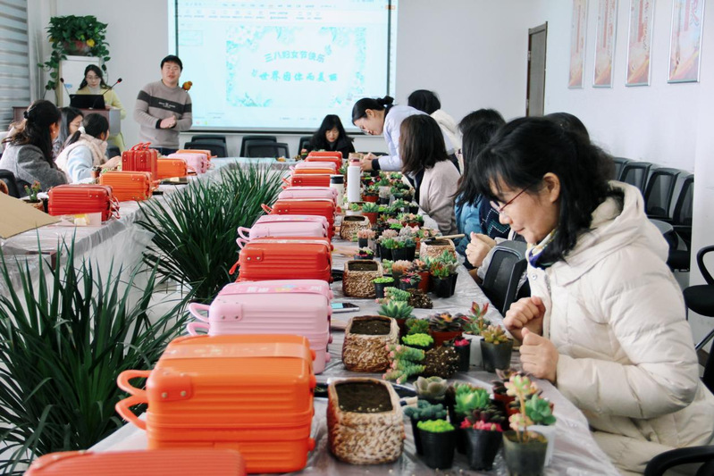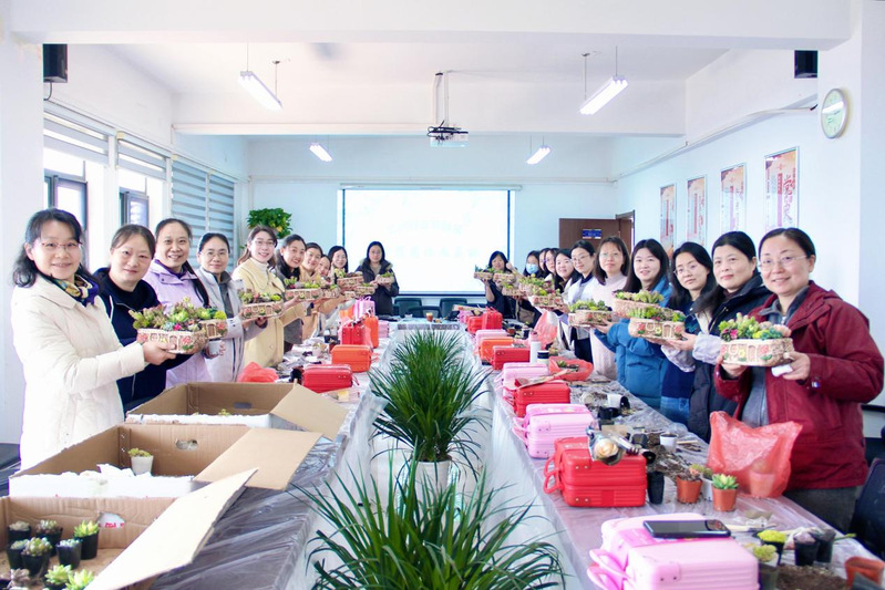 活动分为知识讲解、实践操作和分享交流三个环节。园艺师首先结合办公和家居场景,详细讲解了多肉植物的养护技巧,并现场演示如何搭配土壤、控制浇水量及预防病虫害。在实践环节中,女教职工们手持园艺工具,精心挑选多肉品种,从填土、修根到栽种、装饰,一步步打造出独具匠心的微景观盆栽。活动现场欢声笑语不断,老师们兴奋地展示着自己精心设计的“迷你花园”,纷纷表示“亲手种下绿植,既治愈又充满成就感!这份节日礼物既环保又有意义。”