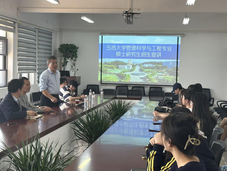 宣讲会上,五邑大学经济管理学院招生负责人首先围绕学院近年招生情况、研究生教育水平、招生政策等方面做了详细介绍。随后,针对管理科学与工程专业进行了详细阐述,并播放了专业招生宣传视频,内容包括学科优势、师资队伍和科研实力等。负责人强调,该专业作为广东省重点培育学科,依托“产学研用”一体化培养体系,聚焦大数据分析、智慧供应链管理、系统工程等前沿领域,致力于培养兼具理论素养与实践能力的复合型管理人才。