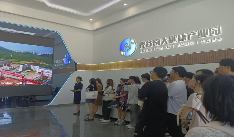 光谷南大健康产业园作为武汉市大健康产业的重要承载地,涵盖了生物医药、医疗器械、健康养老等多个产业领域,致力于打造百亿级产业集群。通过产业园工作人员讲解,同学们深入了解了产业园区位优势、发展目标、建设发展历程、园区功能布局以及建设成效,并对大健康产业链有了更清晰更全面的认识。