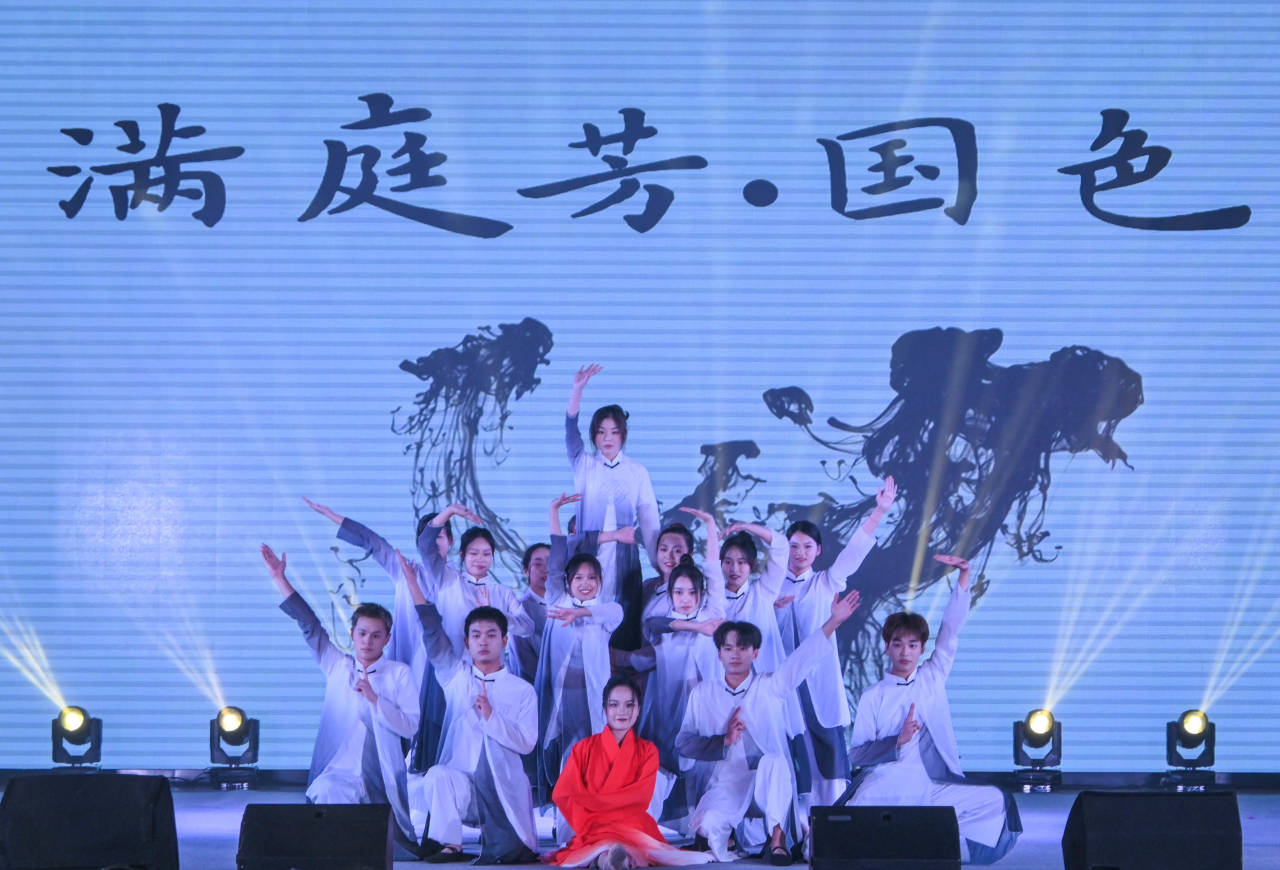 天地浩瀚,日月星辉。彩绘千年,呈华夏之色;浓情婉婉,绎华夏之魂。我院参赛队伍为观众带来舞蹈《满庭芳·国色》,以中国传统颜色螺青、湘叶、桃红、山矾、月魄为元素串联,通过剑舞、水袖舞、长绸扇舞、折扇舞来展现自然万物、天地四时之美,凝聚中华民族文化之魂。