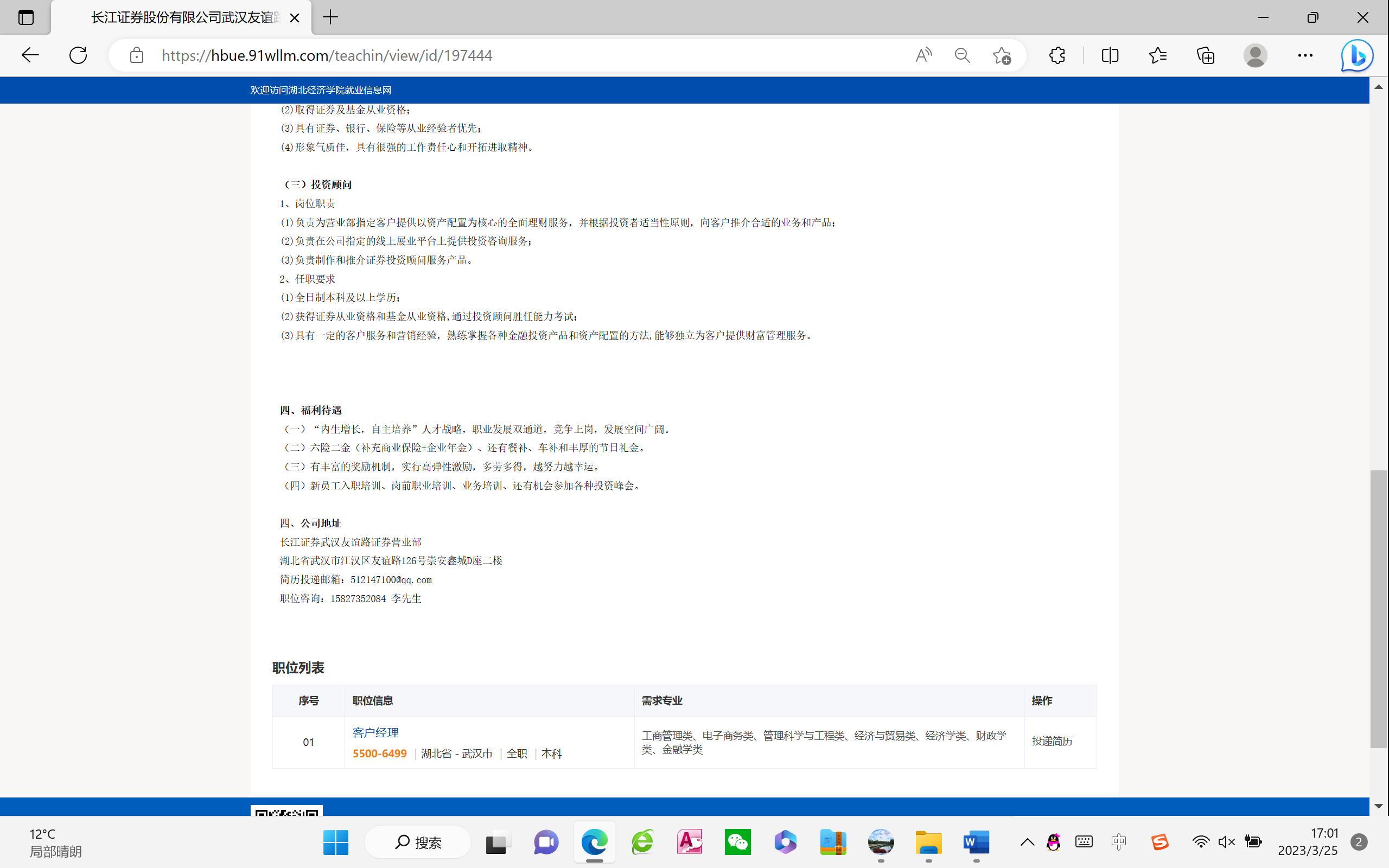 长江证券股份有限公司武汉友谊路证券营业部 招聘信息