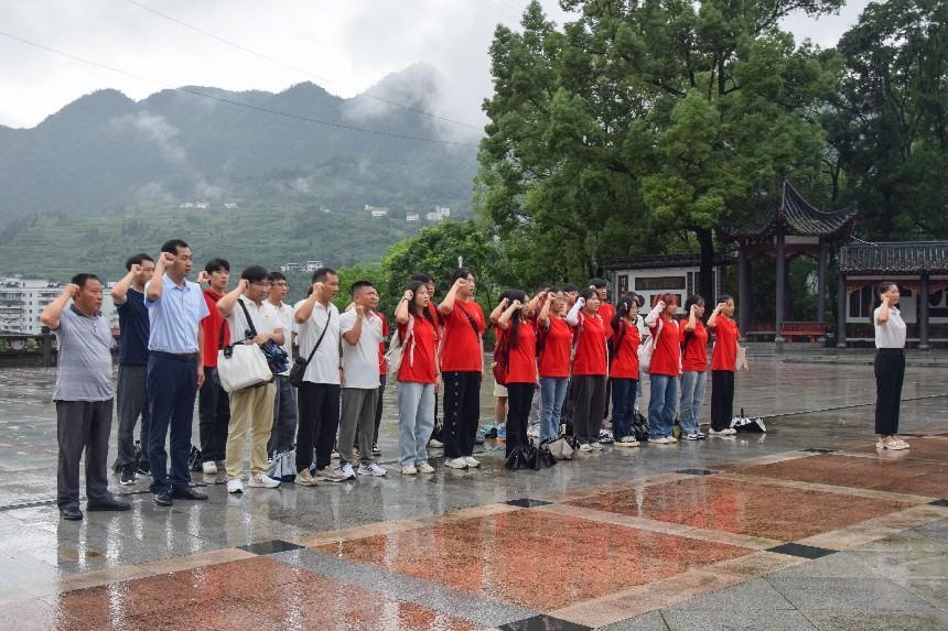 团队一行人先来到位于鹤峰县容美镇的湘鄂边苏区烈士陵园,在广场重温入党誓词。革命先烈们为共产主义抛头颅,洒热血的信仰感人肺腑,令人动容。苍山矗立,雨声悲怆,在湘鄂边苏区革命烈士纪念碑前,学院领导、老师和同学们肃穆而立,鞠躬默哀,寄托对革命烈士的无限追思。