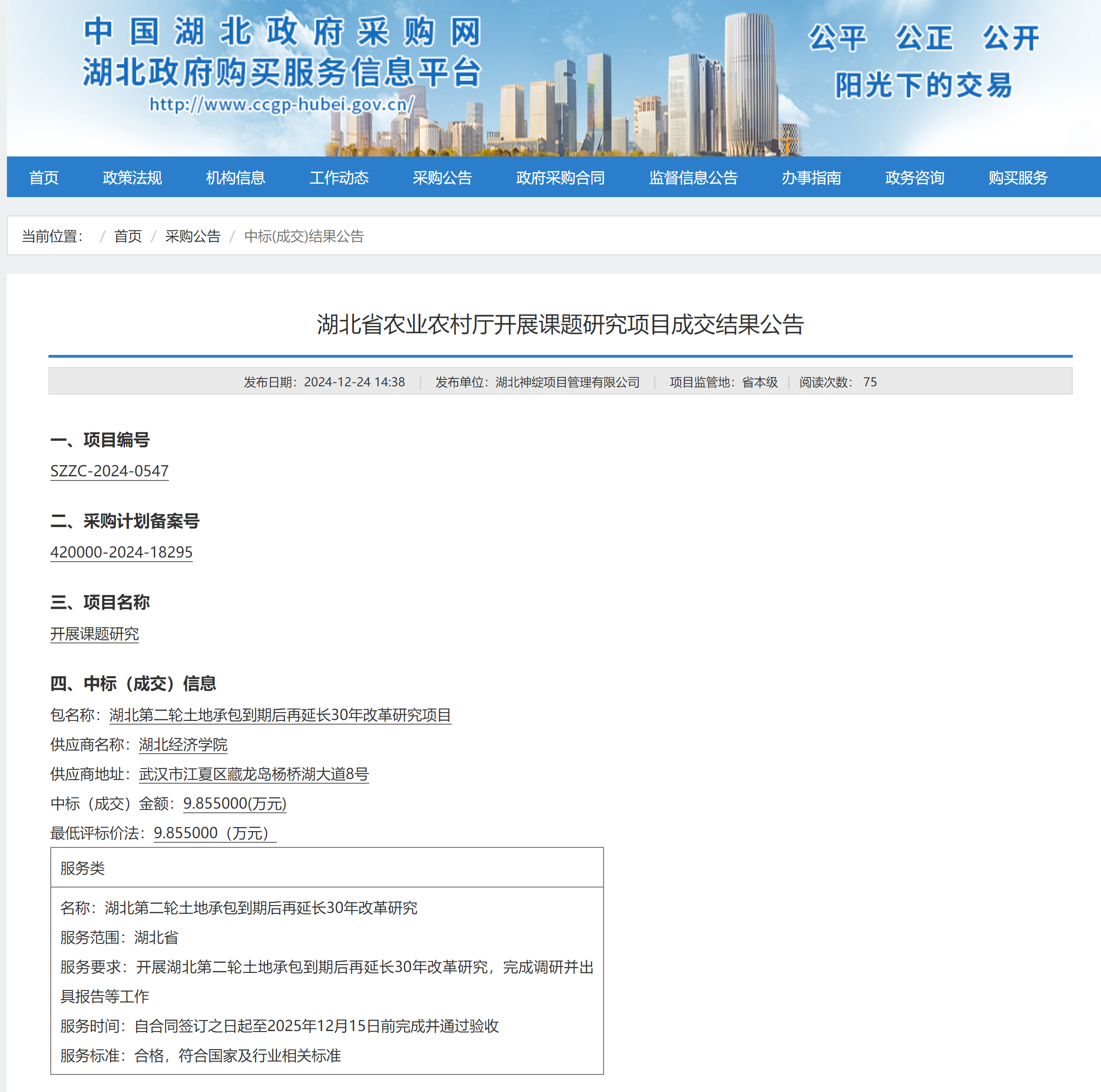 2024年12月24日,中国湖北政府采购网公布中标结果公告,betway唯一官网中标湖北省农业农村厅课题研究项目《湖北第二轮土地承包到期后再延长30年改革研究项目》。